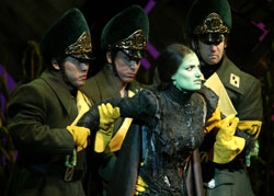 現在他們都成了追捕艾科芭的官員。費耶路越來越難以忍受這些事,亦不太想和葛玲達結婚。葛玲達卻仍在遐想。("Thank Goodness")另一邊,娜莎露絲為了留住波奇,把繼承自父親的權力濫用。艾科芭治好了她的腳,娜莎露絲卻錯手弄的波奇半死不活,艾科芭情急之下將波奇變成鍚人。雖然沒有了心,至少仍活著。("Wicked Witch of the East")艾科芭再次到綠寶石城,要釋放動物,被大巫師阻止。她幾乎被其甜言蜜語說服,("Wonderful")卻因為見到一隻完全和普通羊無異的基路文博士而拒絕並逃走。她被費耶路和葛玲達救出。這時卻發現費耶路愛上了艾科芭,葛玲達悵然。("I am Not That Girl (Reprise)")