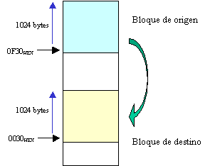 La instrucción MOVC mueve un byte entre la dirección dada por SI hasta la dirección dada por DI.