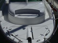 La cabina de proa es muy espaciosa,asi en la parte de atras, en vez de conejera, en su suelo se ponen varios cajones de estiba, y encima, se puede dejar para objetos grandes o poner encima una colchoneta para hacer cama de matrimonio(opc)y un wc quimico. En el lateral hay un soporte para guardar cañas..