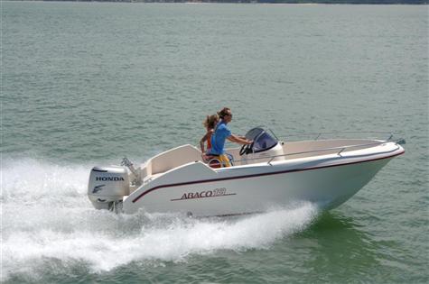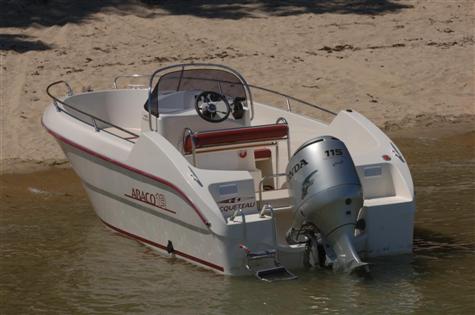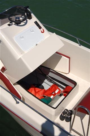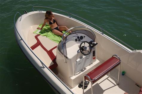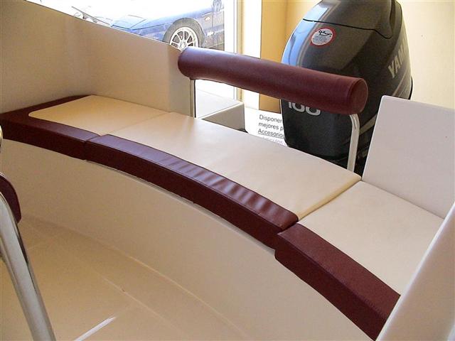 Modelo de OCQUETEAU,con espacio y gran habitabilidad, con cama proa SOLARIUM(opcion) tranformable en mesa y asiento para 4 personas, mas la consola-patronera, con asiento piloto muy moderno, conduccion de pie o sentado - Asiento en popa para 3 personas - ESCALERA ACERO INOX - CAJA BATERIAS Y DESCONECTADOR(con pack motor) -