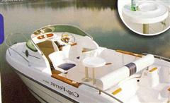 En este modelo en cambio, se puede tomar el sol,comer,poner una mesa, un compack MP-3, una tv, un wc quimico,una cabina con " 2 camas" - un toldo de sol, es una moto para 4 personas. Ademas ocupa con remolque solo 4,80m encima del remolque, contando la lanza y la altura, no llega a 1,70 m. MEDIDAS: 4,50 X 1,92 m. -- Peso en orden de marcha:300kl -- Potencia maxima: 50 cv -- Velocidad:32 nudos Cat: C 5 personas