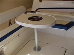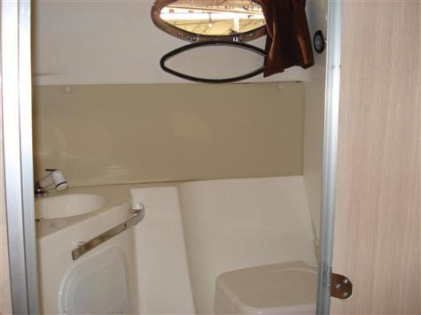 -En la parte central de cabina de proa, se crea un espacio mas diafano, facil de limpiar, quitando moquetas.Dispone de un gran mueble de estantes, para carretes,cebos artificiales, nylon, plomos, cajas de pesca, y otros accesorios de pesca.Dos grandes perchas para ropa, La cabina ya en proa,tiene dos camas en v, bajo las cuales hay grandes cajones de estiba.
