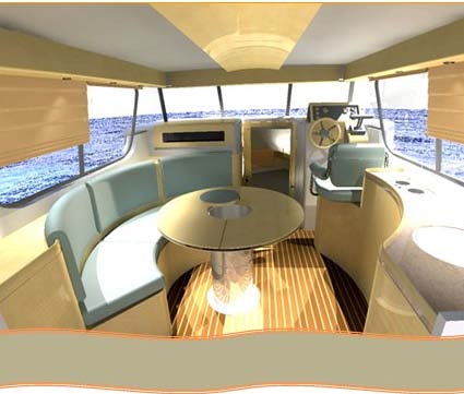 Su volumen interior es impresionante, con un gran acabado de ebanisteria fina. Tiene un salon con un nuevo estilo de modernidad, sus armoniosas lineas, con una tapiceria beig en tonalidad baja, unido a las maderas tambien tonos claros, confieren al salon y a todo el buque, un espacio muy luminoso, junto a un gran confort y elegancia. - Bloque de cocina, muy lujosa, preparada para navegacion de altura, con frigo de 110 litros, microondas, cocina con dos fuegos, y numerosos armarios y cajones