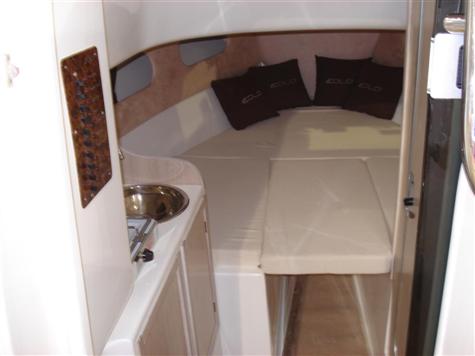 La cabina de proa es muy espaciosa,asi en la parte de atras, en vez de conejera, en su suelo se ponen varios cajones de estiba, y encima, se puede dejar para objetos grandes o poner encima una colchoneta para hacer cama de matrimonio(opc)y un wc quimico. En el lateral hay un soporte para guardar cañas..