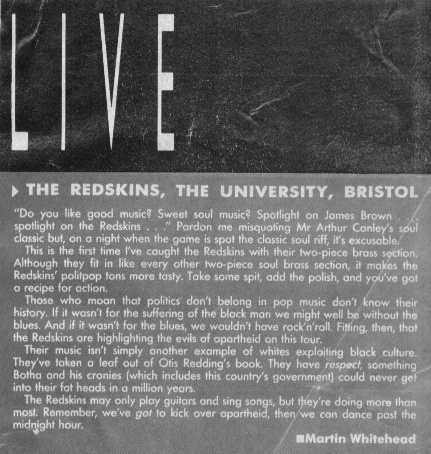 At a time when all my school friends and i were listening to punk and ska many bands as joe strummer aply put it "were bumming a ride on the rock n'rollercoaster" and these bands all started sounding the same.Then came the Redskins with a completely unique style of music, with tinges of the clash, the jam and 60's soul and motown. They also looked good in their skinhead gear and their was real emotion in their songs. This cd is a classic phase in music.I hope you enjoy it.
