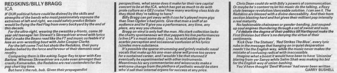 Along with the Style Council, Test Dept. and Billy Bragg, the Redskins were at the forefront of British rock's Socialist movement. Led by guitarist Chris Dean (who was a New Musical Express scribe under the name X. Moore,), the trio augments an R&B-influenced sound with keyboards and a horn section, covering much the same musical terrain on Neither Washington nor Moscow as the first Dexys album, only marred by erratic production and mastering. Most of the songs are simple and catchy, and almost all the titles end in exclamation points! More important to the comrades than tunes, however, are lyrics � each song is a call to arms for the oppressed to rise up. Though doctrinaire, the Redskins are dead honest, committed to what they're doing and make some good music. There aren't many bands around these days with those qualities.