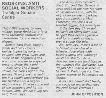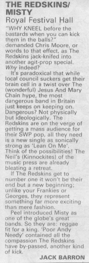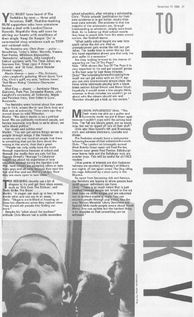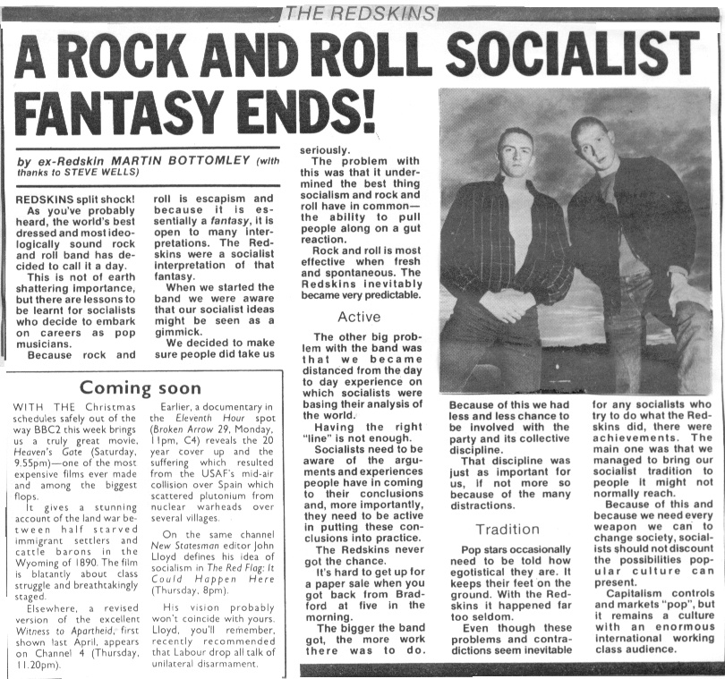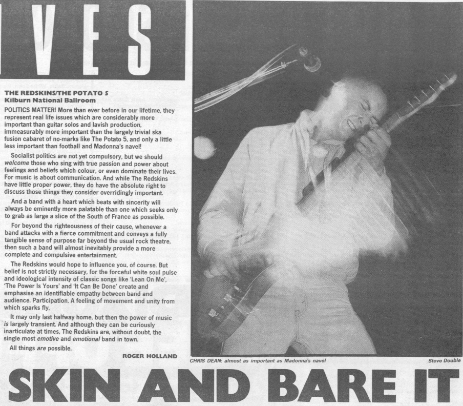 If you didn�t divine it from their name (�red skinheads�) then the continuation of the title - ��but international socialism� - would tell those clued into far-Left politics that the Redskins are members of the Socialist Workers Party (UK division). And this is heavy-duty rabble-rousing - every title is dressed with an exclamation mark and acts as a call to the barricades in itself. Kick over the statues! Go get organized! Bring it down! etc. Too much to take? You�d be surprised. The Redskins set the urgency of early punk to sweet soul horns, aiming to �walk like the Clash and sing like the Supremes�. The latter goal isn�t scored - Chris Dean�s vocal is a lot closer to Joe Strummer than to Diana Ross - but the arrangements are intelligent, if rather inconsistent in quality.And for those of us who have always wished for a more coherent political pop that went beyond mere pose, these calls to arms are really quite refreshing.