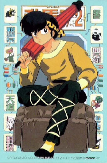 | Age - 16 Family - 'Yoiko' Hibiki, Checkers Hibiki, and parents who are always lost. Curse - Black Piglet Attacks - shi shi hokodan, umbrella, breaking point, bandanas Ryoga is a very determined, poectic young martial artist. He considers Ranma his rival, of which started over bread at school and ended up with Ranma knocking him into 'Spring of Cursed Drown pig' whislt in Jusenkyo, China. Ryoga had followed Ranma there because he believed that Ranma had run away from a aranged fight they organised, only it took Ryoga four days to get there. (The lot at the back of his house). Ryoga has two major character flaws. (well, except turning into a pig) The first, is his terrible sense of direction. He always gets lost and I mean always. Poor Ryoga. And of course Ranma doesn't give him a break for this. The second is how gullible he is. Ranma can trick him incredibly easily by dressing up and pretending to be his sister, fiancee etc and Ryogas none the wiser. Shampoo also finds this flaw an avantage. Overall I think Ryoga is a sweet, sensitive character who is greatly misunderstood. hes my favourite character because hes just so appealing. Unfortuanatly, he also has a bad temper when provoked (usually by Ranma). Also he has a huge crush on Akane, who adopted 'P-Chan' and even lets him sleep in her bed. Later on, Manga only however, he finds the girl who may well be his soul mate, Akari Unryuu, a sumo pig breeder who is totally obsessed with pigs and is delighted when Ryoga tells her his secret. |