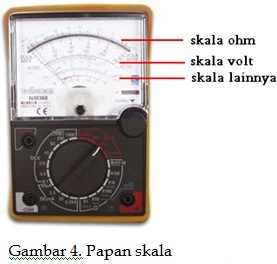 1. Papan skala: digunanakan untuk memebaca hasi pengukuran. Pada papan skala terdapat skala-skala; tahanandalam satuan ohm, tegangan ACV dan DCV, dan skala-skala lainnya. Lihat gambar 4.