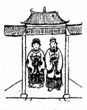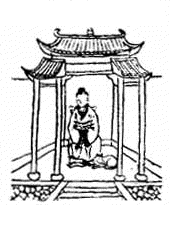 圖中一人坐椅上坐北朝南,一人揹弓立南朝北