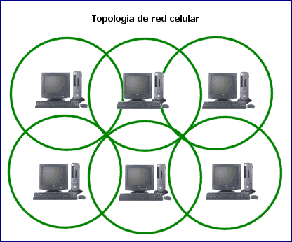 Topología de red celular La topología celular está compuesta por áreas circulares o hexagonales, cada una de las cuales tiene un nodo individual en el centro. La topología celular es un área geográfica dividida en regiones (celdas) para los fines de la tecnología inalámbrica. En esta tecnología no existen enlaces físicos; sólo hay ondas electromagnéticas. La ventaja obvia de una topología celular (inalámbrica) es que no existe ningún medio tangible aparte de la atmósfera terrestre o el del vacío del espacio exterior (y los satélites). Las desventajas son que las señales se encuentran presentes en cualquier lugar de la celda y, de ese modo, pueden sufrir disturbios y violaciones de seguridad. Como norma, las topologías basadas en celdas se integran con otras topologías, ya sea que usen la atmósfera o los satélites.