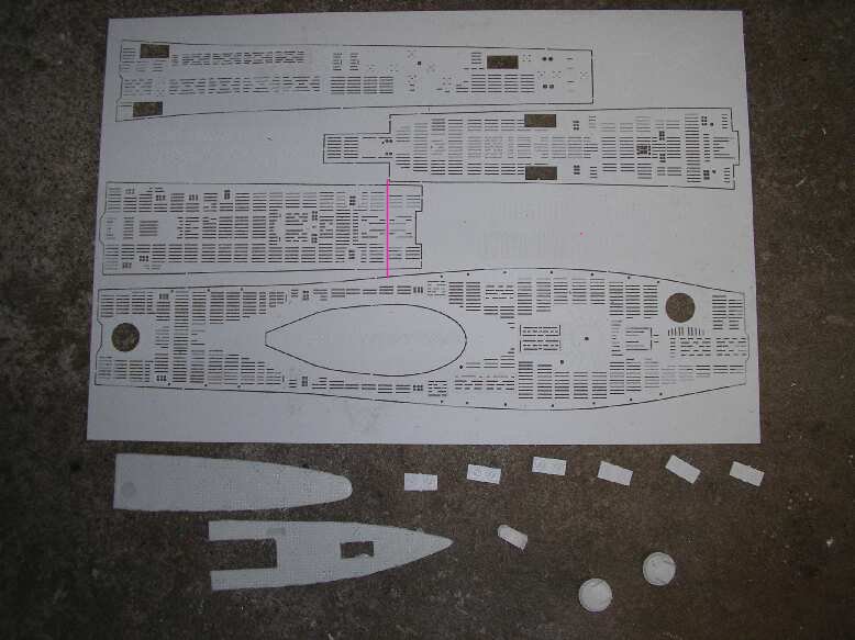 Abbildung 19: Es gibt noch ein zweites Problem - Stichwort Bajonettverschluss: Bei der Drehung wird es an der Aussparung rechts neben der rosa Linie ein Problem geben (dieses Decksteil sitzt genau am Ende des Mittelteiles), deshalb muss das Deck etwas geändert werden. Möglicherweise werd' ich das Deck an der rosa Markierung trennen (d.h. Deck wird um 2 cm nach achtern gerückt und das abgeschnittene Stück zusammen mit dem Achterdeck auf die Heckattrappe geklebt). Soweit meine Theorie: Ob das glattgeht kann ich aber erst sagen, wenn das Bugteil mit dem Mittelteil verheiratet ist.