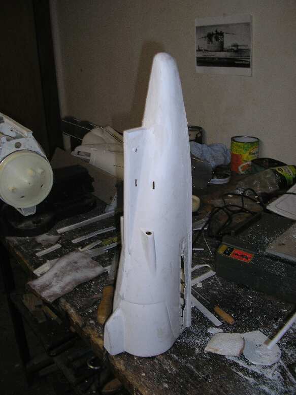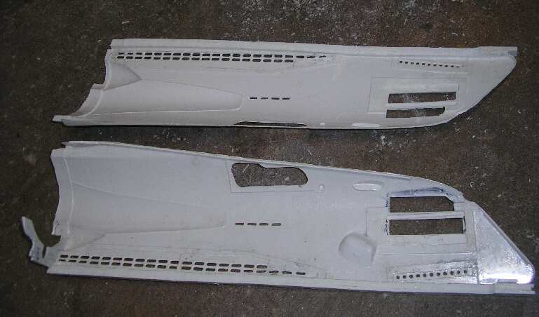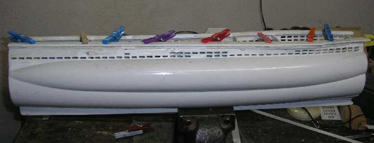 Abbildung 16: Zum Erhöhen der Oberdecksauflagen wurden 3 mm ABS-Reste aus dem Baukasten verwendet, je drei Stück übereinander geklebt und zu 10 mm breiten Leisten geschnitten. Anschließend wurden diese mit ACETON auf den Rumpf geklebt und werden später zusammen mit den Kanten des Oberdecks verschliffen. |