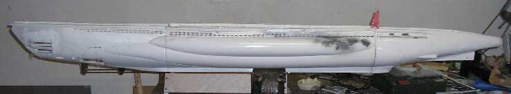 Abbildung 18: .... provisorisch an das Mittelteil zu heften und den gesamten U-Bootrumpf zusammensetzen zu können, damit schon mal ein Gesamteindruck entsteht. Im Anschluss an diese Aufnahme wurden die Decks aufgelegt |