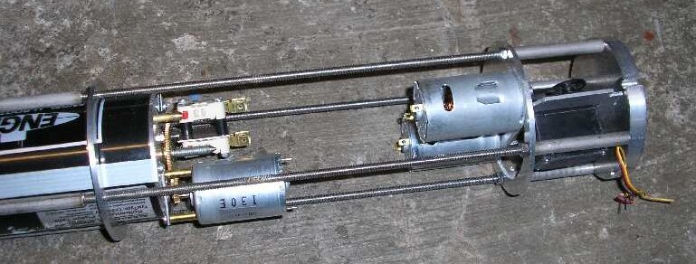 Lösung: Halterung über einen Stößel, d.h. an den Druckbehälter muss ein Röhrchen quer zur Fahrtrichtung angelötet werden. Durch das Torpedorohr kommt ebenfalls eine Bohrung, die verstärkt werden sollte, da diese Stelle den Federdruck abstützen muss. Und durch diese Löcher reicht ein Stößel, der an einem Servoarm befestigt ist. Sobald dieser Stößel herausgezogen wird, schnellt die Feder den Torpedo nach vorne und dadurch wird der 2 mm Messingdraht aus dem Ausstoßröhrchen herausgezogen, so dass der Torpedo per Gas weiter läuft- soweit die Theorie. Ob's klappt wird man seh'n.......