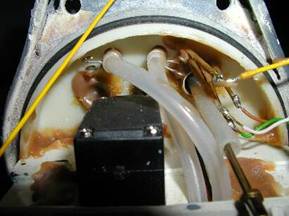 Neben der Kabel- ist auch die Schlauchdurchführung zu erkennen. Hierzu wurden zwei Schlauchverbinder (Marke GRAUPNER) in den Deckel eingeklebt und anschließend die Silikonschläuche (KRICK; 5 x 2,5 mm) Innen sowie Außen mittels Schlauchschellen gesichert.
