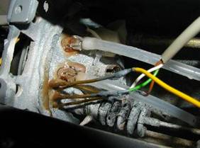 Ich habe 4 Kabel aus dem Druckkörper gelegt (Querschnitt 0,14 mm2, die 3 zusammengehörenden Adern (weiß, grün und braun) sind für die Beleuchtung vorgesehen und die einzelne Gelbe für die Antennenführung zum Turm hin, die dann auf den Netzabweiser gelegt werden soll.