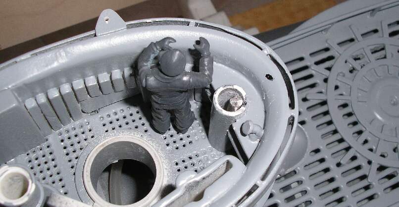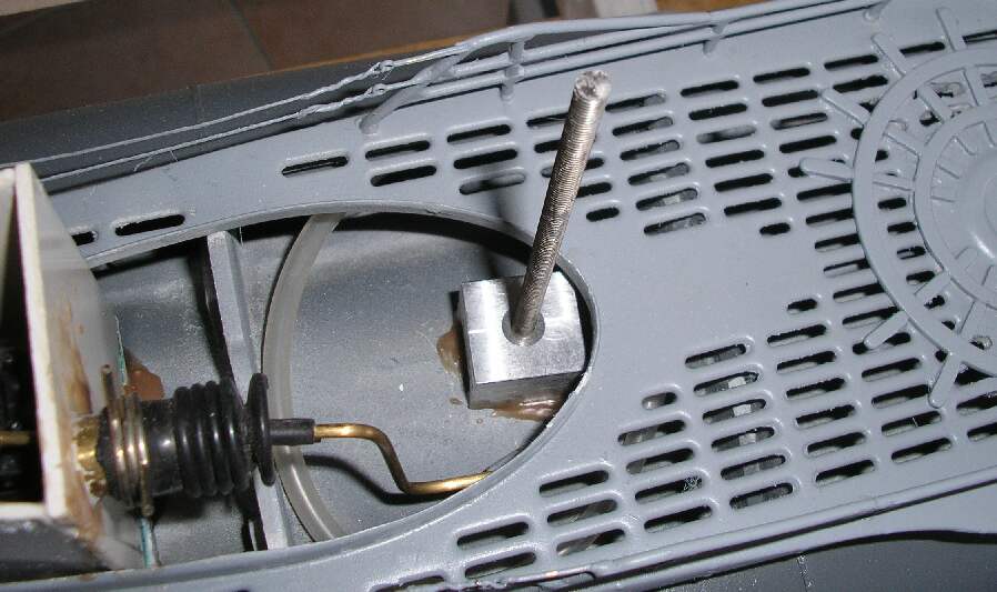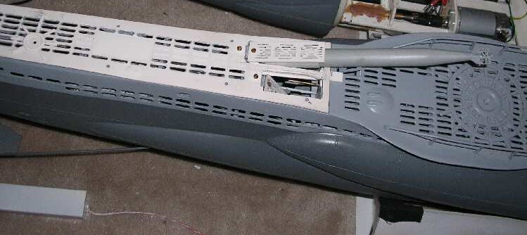 So habe ich z. B. das Servogehäuse, welches das Servo zur Ansteuerung der vorderen Tiefenruder beinhaltet, unterhalb des Turmes eingebaut. Dieses Gehäuse wird nach Abschluss der Justierungsarbeiten mit dem zugehörigen ABS-Deckel zugeklebt, damit dieses dann zusammen mit dem Druckkörper ein geschlossenes System bilden kann (d.h. es wird zusammen mit dem Druckkörper unter Druck gesetzt, denn es befindet sich eine Bohrung für das Servokabel dazwischen). Dieses Gehäuse wurde mit reichlich STABILIT auf den Druckkörper geklebt („…das soll ja schließlich dicht sein“). Zur Not kann der Deckel aufgebrochen werden, ein Neuer ist schnell angefertigt. Das zugehörige Servokabel reicht von der Länge her locker zum achteren Druckkörperende und kann mühelos am Empfänger eingesteckt werden.