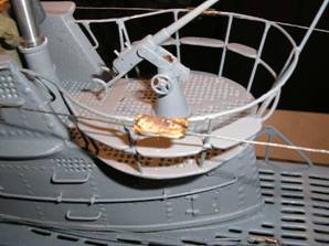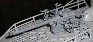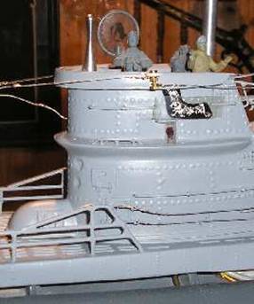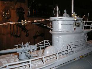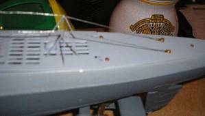 Auf die Netzsäge am Bug hab' ich jetzt doch verzichtet - diese hatten im Atlantik ja sowieso keinen Nutzen und wurden nach einem Erlaß vom Mai '41 sowieso nicht mehr verbaut. Die Herstellung der Antennen bzw. des Netzabweisers erfolgte wie bei meinem alten Boot - abisoliertes und verdrilltes Eisenbahnkabel. |