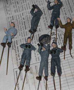 Als ich damals die Figuren zusammen gebaut habe wurden ihre Füße mit 1,2 mm Messingdraht versehen, um die Figuren auf dem Deck befestigen zu können. |