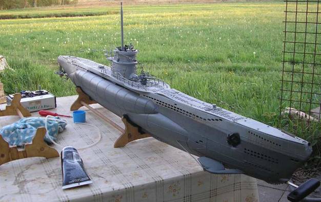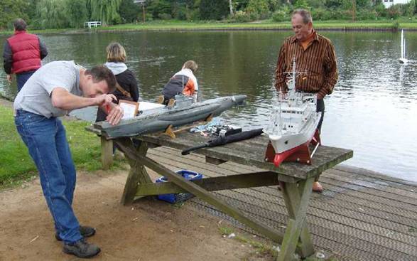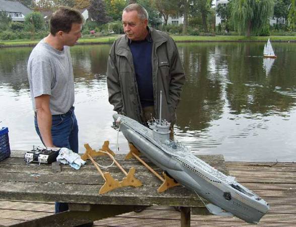 Hier bei einer Fachsimpelei mit einem anderen Modellbauer. Überdruck befindet sich schon im Druckkörper, es fehlt noch die Montage des vordersten Deckteiles, welches ich wegen der besseren Sicht auf die Zentralverschraubung demontiert hatte, dann ist das Boot auslaufbereit. |