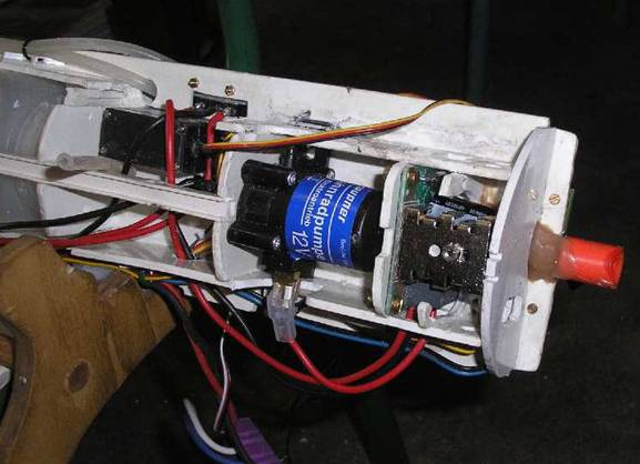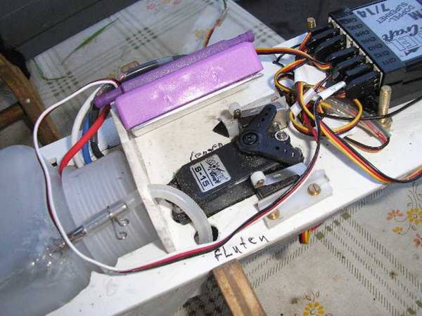 Ferner ist das neu eingebaute Servo sowie die Rolltaster zur Ansteuerung der Pumpe erkennbar. Die Einbauposition des Fahrtenreglers, der sich ehemals an dieser Stelle befand, wurde mit Hilfe eines Alubl4echs ebenfalls geändert. |