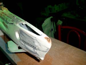 Nun kann man besser erkennen, wo noch etwas am Rumpf auszubessern ist; denn ich will ja schließlich einen makellosen Rumpf haben, bevor ich mich an die Nieten bzw. Schweißnähte mache.