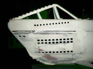 Auch der Sehrohrsockel für das Angriffssehrohr, die Kästen für die Zuluft der beiden Diesel sowie der für den Peilrahmen sind verbaut. Die Änderung des mittleren Wellenbrechers von der Baukastenversion ist auch erkennbar. Der obere Wellenbrecher wird ebenfalls dem Typ VII C angeglichen.
