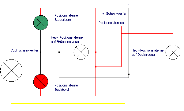 Heck-Positionslaternen (auf Brücken- bzw. Deckniveau), sowie einen Suchscheinwerfer von