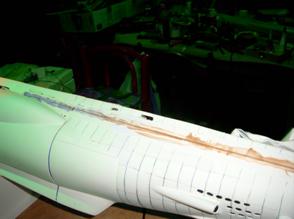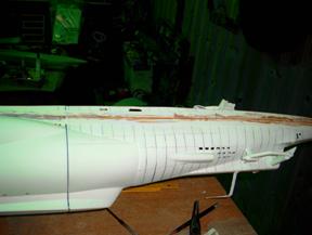 Vor der Fertigung muss die jede einzelne Anordnung angezeichnet werden. Für die Nietenreihen wird das Boot in ein Zebra verwandelt, d.h. Linien in Abstand von 1,5 cm. Die Positionen der Schweißnähte werden ebenfalls ermittelt und angezeichnet. Tja, und wenn alles fertig angezeichnet ist, geht der Spaß erst richtig los: Mit handelsüblichem Tape wird der Bereich um eine angezeichnete Schweißnaht abgeklebt, so dass ein 1,5 bis 2 mm breiter Streifen als Naht übrig bleibt. Dieser Streifen wird dann mit STABILIT gefüllt. Nach dem Aushärten wird das Klebetape vom Rumpf abgezogen und fertig ist die Imitation der Schweißnaht.