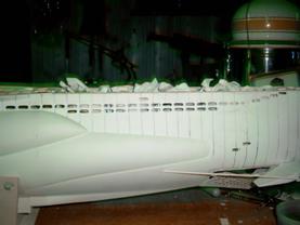 Blick auf den backbordseitigen Heckbereich: Die Positionen für die Nietenreihen und Schweißnähte sind schon angezeichnet, die erste Imitation einer Schweißnaht wurde bereits erstellt. |