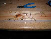 Hier sind die Hilfsmittel zur Herstellung der Oberdecksreling zu erkennen. Diese habe ich nach Originalbildern auf einer Holzunterlage aufgezeichnet, anschließend aus Messingdraht (Durchmesser 2 mm) gebogen, auf der Holzunterlage befestigt (Reißzwecken) und die Relingsteile verlötet.