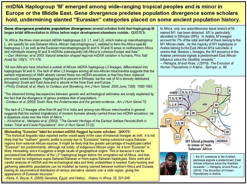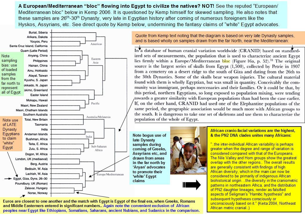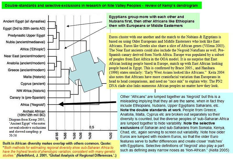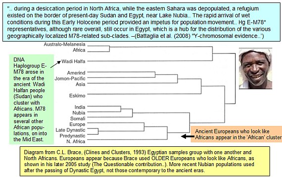 "..sample populations available from northern Egypt from before the 1st Dynasty (Merimda, Maadi and Wadi Digla) turn out to be significantly different from sample populations from early Palestine and Byblos, suggesting a lack of common ancestors over a long time. If there was a south-north cline variation along the Nile valley it did not, from this limited evidence, continue smoothly on into southern Palestine. The limb-length proportions of males from the Egyptian sites group them with Africans rather than with Europeans." (Barry Kemp, "Ancient Egypt Anatomy of a Civilisation. (2005) Routledge. p. 52-60) |
