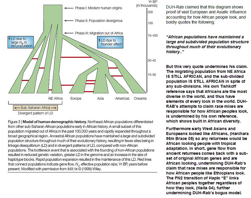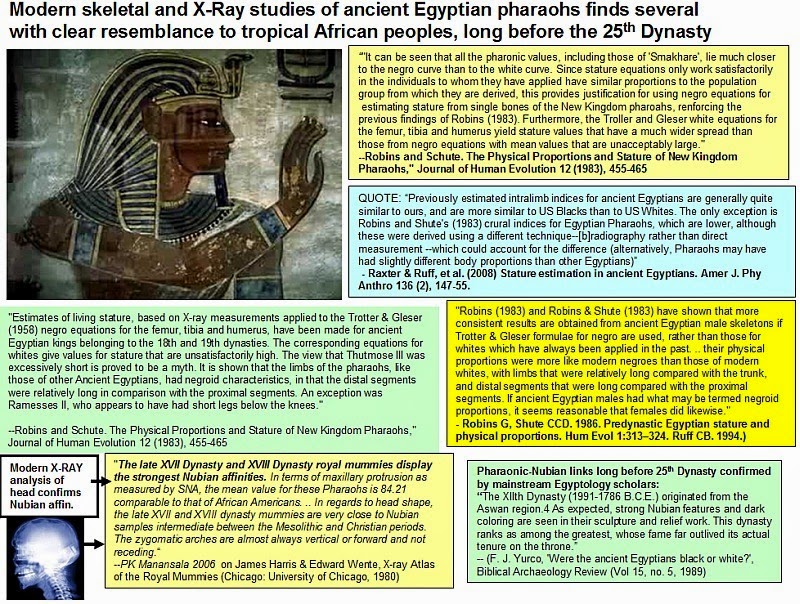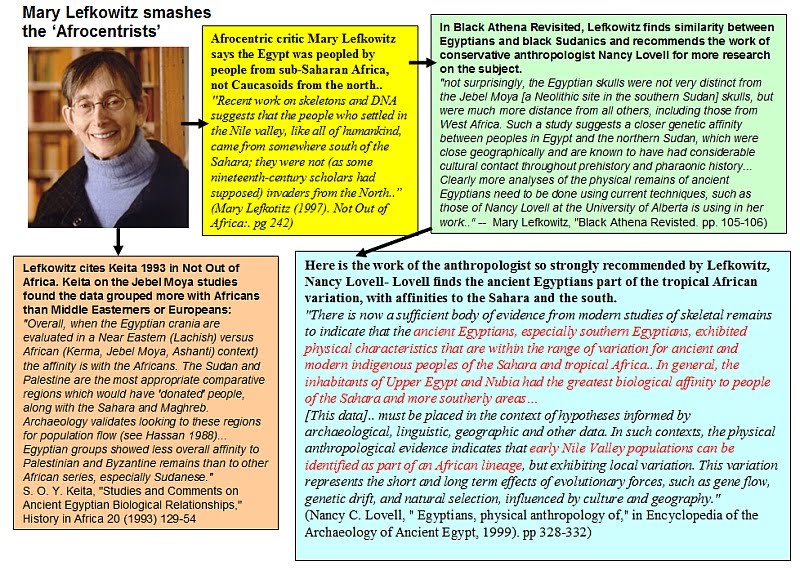 Quotes: There is now a sufficient body of evidence from modern studies of skeletal remains to indicate that the ancient Egyptians, especially southern Egyptians, exhibited physical characteristics that are within the range of variation for ancient and modern indigenous peoples of the Sahara and tropical Africa.. In general, the inhabitants of Upper Egypt and Nubia had the greatest biological affinity to people of the Sahara and more southerly areas." (Nancy C. Lovell, " Egyptians, physical anthropology of," in Encyclopedia of the Archaeology of Ancient Egypt, ed. Kathryn A. Bard and Steven Blake Shubert, ( London and New York: Routledge, 1999) pp 328-332) and "must be placed in the context of hypotheses informed by archaeological, linguistic, geographic and other data. In such contexts, the physical anthropological evidence indicates that early Nile Valley populations can be identified as part of an African lineage, but exhibiting local variation. This variation represents the short and long term effects of evolutionary forces, such as gene flow, genetic drift, and natural selection, influenced by culture and geography." ("Nancy C. Lovell, " Egyptians, physical anthropology of," in Encyclopedia of the Archaeology of Ancient Egypt, ed. Kathryn A. Bard and Steven Blake Shubert, ( London and New York: Routledge, 1999). pp 328-332) |