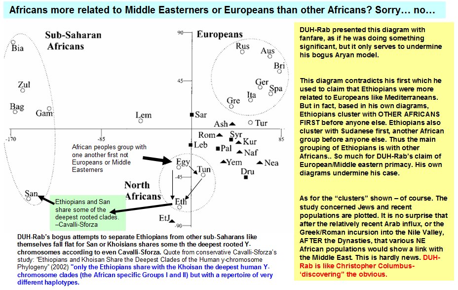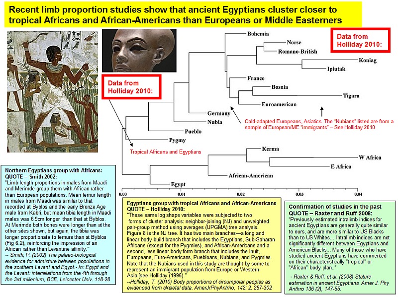 Sub-Saharan Africans on several counts QUOTE: "The biological characteristics of modern Egyptians show a north-south cline, reflecting their geographic location between sub-Saharan Africa and the Levant. This is expressed in DNA, blood groups, serum proteins and genetic disorders (Filon 1996; Hammer et al. 1998; Krings et al. 1999). They can also be expressed in phenotypic characteristics that can be identified in teeth and bones (Crichton 1966; Froment 1992; Keita 1996). These characteristics include head form, facial and nasal characteristics, jaw relationships, tooth size, morphology and upper/lower limb proportions. In all these features, Modern Egyptians resemble Sub-Saharan Africans (Howells 1989, Keita 1995)." -- Smith, P. (2002) The palaeo-biological evidence for admixture between populations in the southern Levant and Egypt in the fourth to third millennia BCE. in E.C.M van den Brink and TE Levy, eds. Egypt and the Levant: interrelations from the 4th through the 3rd millenium, BCE. Leicester Univ Press: 2002, 118-28 |