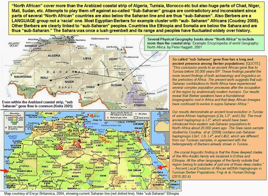 "Populations and cultures now found south of the desert roamed far to the north. The culture of Upper Egypt, which became dynastic Egyptian civilization, could fairly be called a Sudanese transplant." (Egypt and Sub-Saharan Africa: Their Interaction. Encyclopedia of Precolonial Africa, by Joseph O. Vogel, AltaMira Press, Walnut Creek, California (1997), pp. 465-472 ) |