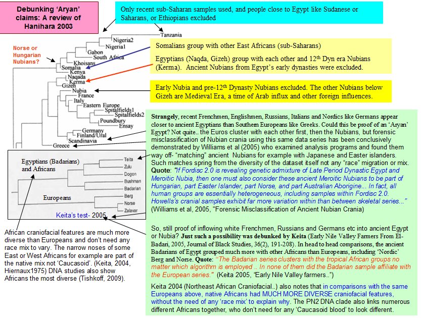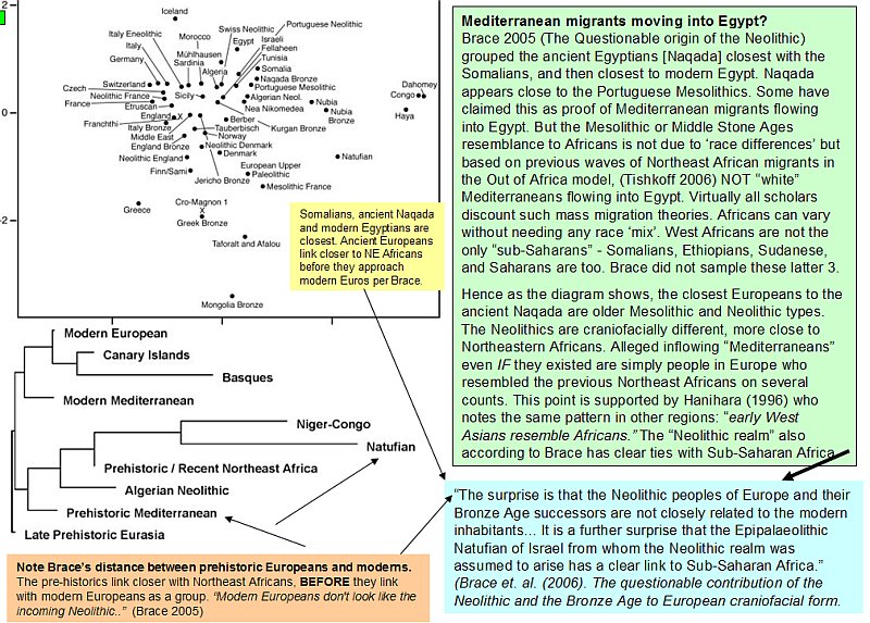 Egyptians cluster closer to other nearby African populations than to Europeans or Middle EasternersSeveral recent mainstream anthropology studies support the close relationship of the Nile valley peoples. This research rejects sensationalist theories that the ancients were of Indian, Australian, Greek, or Nordic stock, or nationalist theories that they are identical to Arabs, West African Bantu or Syrians. Instead they are most closely related to other Nile Valley and East African peoples- Somalis, northern Sudanics, and Ethiopians. This recent research confirms Frank Yurco's statement as to "one Nilotic continuity." For example, a 2005 study by Afrocentric critic C. Loring Brace groups ancient Egyptian populations like the Naqada closer to Nubians and Somalis than European, Mediterranean or Middle Eastern populations. (Brace, et al. 2005). [11a] Other craniometric studies confirm this finding. A 2003 study by Hanihara places the ancient Egyptians (Naqada/Gizeh) closer to Nubians (Kerma), and Somalians closer to other East African populations like Kenyans than to European or Middle eastern populations. (Hanihara 2003) Hanihara (1996) also shows that early West Asians (from what is today's "Middle East") resembled Africans.(Hanihara T., "Comparison of craniofacial features of major human groups," Am J Phys Anthropol. 1996 Mar;99(3):389-412.) [11b] . Such studies are also consistent with metric analyses placing ancient Upper Egyptian populations like the Badari closer to populations in tropical Africa than to Mediterraneans, or Middle Easterners.[11c] Dental studies note the close relationship between ancient peoples of the Badari and Naqada cultures, and suggest that they continued on into the Dynastic period, with Egyptian samples being more closely related to North Africa than to Europe or the Middle East.[11d] DNA research on historical Nile Valley gene flow suggests close relationships and continuity between the Nubian and Egyptian populations, with greater south- north gene flow than north - south gene flow. (Krings 1999).[11e] This south-north movement is consistent with the hegemony of the south and its conquest or absorption of the north, ushering in the period of the Egyptian dynasties. Other studies confirm both Brace and Hanihara's findings:
