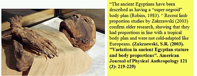 Standards of interpretation: mixed versus variable populationsThe issue of "mixed" populationsAs regards mixed populations, the issues of methodology remain, particularly in view of the makeup or variability of ancient stocks in that region. To what group for example, will a mixed race individual be credited? Variability within individual groups also involves the question of arbitrary assignment. The "Negroid" grouping in the Saharan - Nilotic - Sudanic triangle has ranged from extremely short Pygmy tribes, to slender, seven-foot tall groups with aquiline features and wavy hair. Are the latter "Caucasoid" (as asserted in older histories), of "mixed" race, or simply just another variant within the Nile Valley or Northeast African populations? Similar variability occurs in European populations, with generally longer head shapes (dolichocephaly) seen in Scandinavian and Mediterranean populations, and shorter ones (brachycephaly) seen in central and eastern Europeans, along with clear distinctions on some DNA markers between these populations.[38] And yet it would be difficult to use such variation to biologically justify a rigid racial taxonomy for these European peoples, or to say that they were different races. They are generally seen as simply variants within a larger European population. In Northeast Africa however standards are applied differently according to some mainstream scholars.[39] Some older histories assert a "third race"[40]. A more specific reexamination of the early Nile Valley populations such as the Badari, show several affinities with a range of tropical African types. (S. Keita,'A brief review of studies and comments on ancient Egyptian biological relationships,' 1995)[41] Difficulties with fossil remains and shifting terminology. Some researchers have moved away from the terms "Negroid" or "Caucasoid" in favor of formulations like "Saharan-Nilotic" or Africoid (see Trigger above and Keita below), which emphasizes the direct local area and indigenous populations in the Nile Valley. "Saharan-Nilotic" would include the Sudan, with its well established physical and cultural linkages with Nile Valley populations. Older formulations have included racial terminologies such as "Eastern Hamites" which basically substituted for "Caucasoid". Whatever the terms used, pinning down fossil evidence can be a problematic task. Samples classified as "Eastern Hamite" for example often have the narrow rounded forehead commonly typified as "Negroid".[42] Researchers in the past have also used the term "Mediterranean" for these "Negroid" samples, routinely reclassifying them as such. Alternatives to notion of 'mixed populations. Some scholars such as Alan Templeton have challenged the notion of mixed populations (see DNA Analysis section below) holding that race as a biological concept is dubious and that only a minor percentage of human variability can be accounted for by distinct "races." They argue that modern DNA analysis presents a more accurate alternative, that of simply local population variants, gradations or continuums in human difference like skin color or facial shape or hair, rather than rigid categories. The notion of "mixed races" it is asserted, is built on the flawed assumptions of old racial models. [43] According to Templeton: