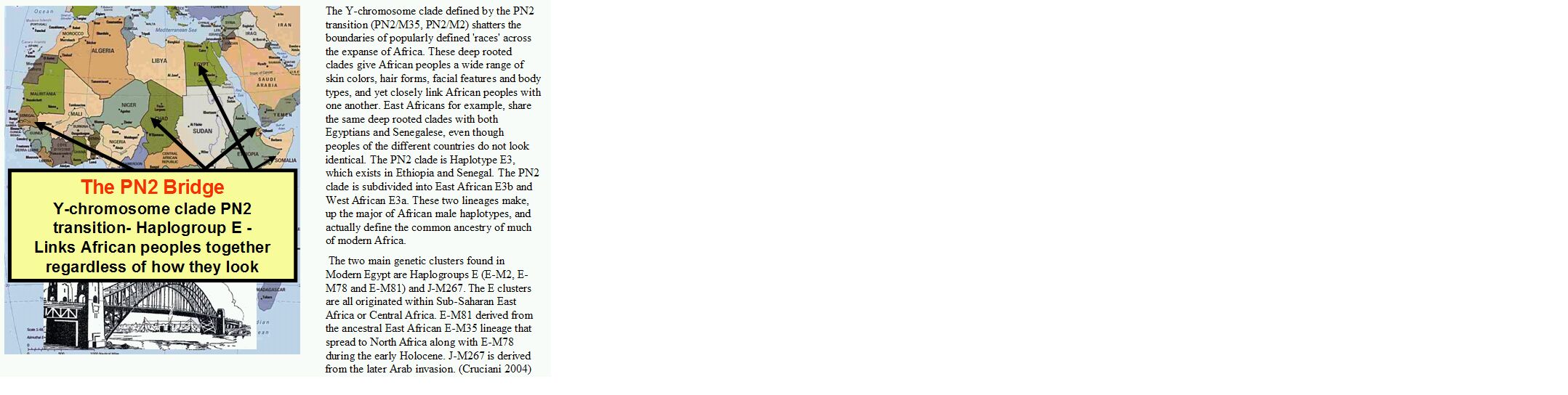 "Representative Africans and backflow theories." Some theories speculate that Y- genetic elements associated with the Haplogroup "E" originally beginning in Africa, flowed out from that source and mutated into other sub-clades such as E-M34 chromosomes. These mutations in turn flowed back into Africa. (Cruciani 2004).50a While gene flow of varying proportions is nothing unusual in the history North and Northeastern Africa, attempts to assign Near Eastern or Mediterranean "racial" categories to the peoples of the region on this basis are problematic. The original Y-chromone marker "root stock" is of African origin, reflecting its beginning base of vast African genetic diversity. Any backflow mutations may simply reflect the built-in diversity inherent in the original root stock which is based in sub-Saharan Africa, not north or Northeast Africa. Haplogroup E is far more diverse in sub-Saharan east Africa than it is in northeast Africa. The ancestors to outside mutations from the Near East and elsewhere, the ancestral YAP+ clades, gave rise to such mutations as haplogroup "D". Other mutations such as E -M34 are dependent on another African ancestor, the undifferentiated E-M35 chromosomes, which are essentially confined to sub-Saharan Africa. Undifferentiated PN2* chromosomes, the ancestral clade needed to give rise to downstream E clades like E1a1a (E3a) and E1a1b (E3b) are rare to non-existent in northeast Africa, and the ancestral YAP+ clades which would be essential to giving rise to haplogroups E and D, are virtually non-existent outside of Africa. (Keita 2004).[51a] In short, backflow mutations are based on African diversity, need ancestor triggers based in sub-Saharan Africa, and are themselves another subset of original sub-Saharan baseline variability, the engine that gave rise to all these variants. Such complexity calls into question attempts to slice up ancient East and Northeast African populations into assigned proportions or percentages of Negroid, Caucasoid, Asiatic, or Middle Eastern race groups. It also calls into question attempts to assign such populations to one monolithic type. Nilo-Saharan and Bantu speakers for example differ in some respects, but both strands are indigenous Africans. And despite their wide dispersion, Bantu speakers cannot be considered to be "representative" of "true" Africans. They are simply one more variant in the mix and groupings of African genetic diversity. Per Tishkoff (2002) "there is not a single representative African population." The PN2 Transition Kittles and Keita (2004) also note the vast genetic diversity of Africans, and how similar looking people may not possess the same DNA pattern. A DNA lineage may also include people who do not look the same outwardly.[51]