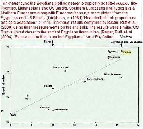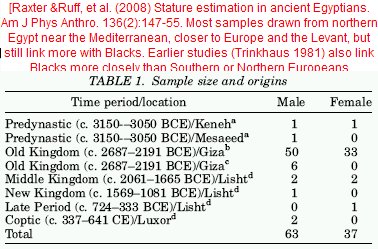 Other limb proportion studies (Trinkhaus, E. 1981. "Neanderthal limb proportions and cold adaptation." p. 211) have compared Egyptians to southern Europeans, Northern Europeans, Euro-Americans and American Blacks, and found that the Egyptians compared more closely with American blacks than with either white group. Later studies, using finer measurements, ((Raxter, Ruff et. al. 2008, "Stature estimation in ancient Egyptians) found similar results for the ancient Egyptians, even when most of ancient Egyptian samples were drawn from Giza, close to the Mediterranean, an area likely to have more migration from white Middle Easterners or southern Europeans. Limb elements of these ancient samples were closer to that of modern US Negroes. Intralimb indices however, showed no significant differences between US blacks and Egyptians. Such links to Africoid or African peoples confirm earlier studies by Robins and Shute (1983) who called ancient samples 'super negroid' and Zakrzewski (2003), as to the affinities of the early Egyptians.