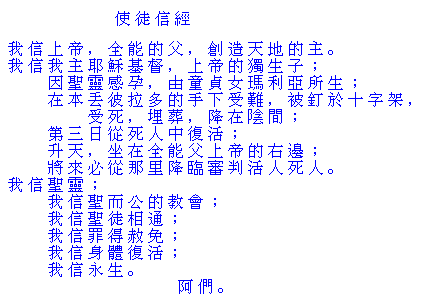 我信上帝, 全能的父, 創造天地的主。 我信我主耶穌基督, 上帝的獨生子; 因聖靈感孕, 由童貞女瑪利亞所生; 在本丟彼拉多的手下受難, 被釘於十字架, 受死, 埋葬, 降在陰間; 第三日從死人中復活, 升天, 坐在全能父上帝的右邊; 將來必從那里降臨審判活人死人。 我信聖靈; 我信聖而公的教會; 我信聖徒相通; 我信罪得赦免; 我信身體復活; 我信永生。 阿們。