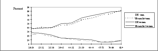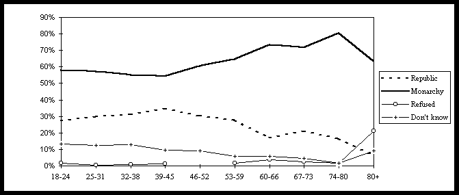 Support for the monarchy tends to increase with age (see Figures 1), with 72 per cent of respondents of 65 years and over preferring the monarchy, compared with 23 per cent support for a republic. It is hardly surprising that, of all respondents, elderly women are the most devoted in their support for the monarchy. In contrast, in every age category up to 55 years opinion favours a republic over retention of the monarchy - for example, of those in the 18 to 24 year age group, 36 per cent are monarchists and 41 per cent republicans.