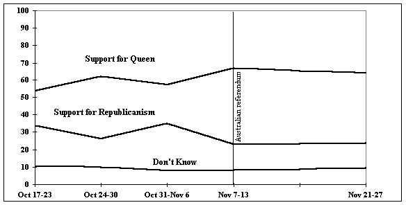Although support levels began at almost precisely the 1996 levels, during the three weeks leading up to the Australian referendum support for the monarchy tracked upwards, reaching a high of 67 per cent immediately after the Australian results became known.