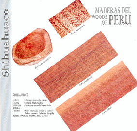 DISTRIBUCIÓN GEOGRÁFICA En el Perú se encuentra principalmente en los departamentos de Loreto, San Martín y Ucayali. Se ubican en los bosques primarios en terrenos de buen drenaje en formación ecológica o zona de vida bosque seco. DESCRIPCIÓN DE LA MADERA COLOR : En la madera seca al aire la albura se torna de color blanco rosáceo y el duramen marrón rojizo BRILLO : Moderado a elevado GRANO : Entrecruzado TEXTURA : Media VETEADO : Bien definido, arcos superpuesto y bandas angostas, paralelas, satinadas, jaspeado amarillo en la seccion tangencial. PROPIEDADES FÍSICAS DENSIDAD BÁSICA : 0.87 gr/cm3 CONTRACCION VOLUMETRICA : 15.00 % RELACION T/R : 1.60 CONTRACCION TANGENCIAL : 9.10 % CONTRACCION RADIAL : 5.50 % CARACTERÍSTICAS DE LA TROZA DIÁMETRO : 0.64 m FORMA : Regular DEFECTOS : Agrietamientos internos y acebolladuras CONSERVACIÓN : Mantener la troza sumergida ASERRIO Y SECADO : Especie difícil pues presenta grano entrecruzado y de alta dureza recomendandose estelitar las sierras. El comportamiento en elsecado es suave de 10 dias para piezas de pequeñas dimensiones como el parquet . Para otras dimensiones mayores presenta problemas de alabeos. DURABILIDAD : Presenta una buena resistencia al ataque de hongos, termitas e insectos de madera seca y no requiere de preservación USOS : De acuerdo a las propiedades descritas, la madera de Shihuahuaco, puede utilizarse en estructuras, vigas columnas, en pisos, durmientes, carpintería de exterior, armazón de barcos, carrocerías, machihembrados y parquet.. Fuente:INIA-ITTO-PROMPEX |