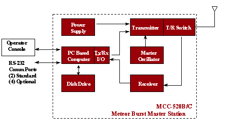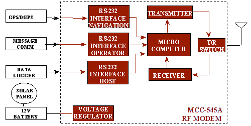 B= LA UNIDAD MCC-545 RF MODEM La unidad MCC-545 RF MODEM , es un compacto transmisor -receptor de radio , con capacidad inteligente , que puede enlazar , con toda confianza a usuarios que desean transmitir o recibir flujos de datos. actúa en los rangos ELOS (extended- line- of- sight, desde los 0 hasta los 400 kilómetros), y MBC(meteor burst communication, desde 400 hasta 1,600 kilómetros), pudiendo transferirse tecnologías en forma imperceptible ("SIN COSTURA"). Este dispositivo, permite realizar comunicaciones, en doble vía, de transferencia de datos y mensajes, lo que posibilita soportar una amplia variedad de aplicaciones. El MCC-545 , permite una operación sencilla de interfase , realizándose una interconexión de computadoras , dataloggers u otras fuentes de datos periféricos del usuario. Puede ser alimentado por una fuente externa de energía eléctrica de varios voltajes AC ~ DC o también directamente desde un panel solar con su bloque de baterías. Para su diseño se ha tomado en cuenta que debe operar en condiciones de intemperismo extremo, como unidad remota de telemetría. Puede ser instalado en diversos móviles tales como: a- vehículos terrestres (transporte masivo de pasajeros , de carga, automóviles particulares o de servicio de taxis, distribución de productos, ambulancias , patrulleros policiales de ciudades o de caminos, trenes de carga y pasajeros, etc.). b- Unidades marítimas, lacustres o fluviales (BOYAS OCEANOGRAFICA DE MONITOREO OCEANICO fluvial o lacustre, IMPLEMENTACION DE SISTEMAS SCADA Y / O "VMS" abordo de barcos multimodales, transportes de carga, de pasajeros, ferries, petroleros, de pesca industrial, deportivos y de recreación, de guerra, lanchas rápidas de control de transporte fluvial o lacustre, etc.). c- Aeronaves de distinta clase tales como aviones de líneas comerciales domesticas, de instrucción, deportivos, de carga, helicópteros de pasajeros, de patrullaje , de monitoreo periodístico, de guerra, globos aerostatitos, dirigibles, sondas meteorológicas dirigidas etc. Toda esta flexibilidad de instalación en diversas plataformas móviles, permiten realizar un eficiente manejo de flota ("Fleet Management"), así como también obtener aplicaciones para un Sistema de información automática (" AIS" ). ESPECIFICACIONES DEL MCC-545 TRANSMISOR = Rango de frecuencias entre 40- 50 MHz. = Potencia en antena es de 100 watts. = La modulación es bifásica y del tipo PSK = La impedancia es de 50 ohmnios. = El régimen de transmisión de data es de 4 ~ 8 kbaudios. RECEPTOR = Sensibilidad : - 123 DBM ( BER < 10-3, @ 4 Kbps). = Modulación : bifásica tipo PSK. = Data Rate : 4 ~ 8 Kbps. = Impedancia: 50 Ohmnios. = Filtrado de ruidos : > 20 Decibelios. MICROCOMPUTADOR CONTROLADOR = Tipo : 32-Bit CMOS = Software : MBNET-200. = Reloj de tiempo real: Sincronizado , con sistema de 24 horas.