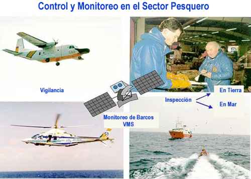 De igual forma , por este medio reciben instrucciones adicionales desde su central operativa. Al arribar a puerto , remiten un informe detallado de todas las actividades de pescas realizadas por el barco, en elperiplo. 4- DIARIOS DE BITACORA Este es el documento mas importante que se lleva abordo y tiene maximo poder legal . Alli se registran de puno y letra del capitan del barco pesquero, todos los acaecimientos y en especial los referidos a las capturas , volumenes , posiciones geograficas, especies capturadas, rtamanos de ellas , etc. Una copia de estos documentos debe de ser enviada a la autoridad gubernamental , cada termino de viaje y arribo a puerto , con la firma del capitan , el que se hace responsable legalmente de la veracidad de los datos alli puestos. 5- INSPECCIONES DE FONDEO O AL ANCLA Este tipo de monitoreos o inspecciones se realizan en forma inopinada e intempestiva, con el maximo de sigilosidad, . consiste en que un grupo de inspectores de la autoridad gubernamental maritima se hacen presentes con las respectivas credenciales de acreditacion abordo de el buque a inspeccionar y realizan todo tipo de averiguaciones y verificaciones de todo lo relacionado con las operaciones de pesca relizadas por dicho barco, incluyendo las mediciones de ejemplares , tipo o especies capturadas con sus volumenes de pesca. verifican los documentos oficiales de baordo como el diario de bitacora y el libro de maquinas ademas de realizar entrevistas a los tripulantes que ellos decidan de tal forma que , con todos los datos elaboran un informe y lo remiten a la autoridad gubernamental maritima. 6- SISTEMAS COSTEROS DE RADAR Este tipo de sistemas requieren de un programa muy complejo y costoso para su funcionamiento a maxima capacidad. Son radares de gran poder de emision que estan orientados a la deteccion de blancos en la superficie del mar y a gran distancia, generalmente las antenas de estos radares son ubicadas en lugares de gran altura pero orientadas a la costa para la deteccion de todosa los contactos de superficie. la informacion obtenida por estos radares es enviada a centros de recopilacion de datos y alli es procesada.