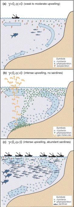 Much of what Bakun and others has suspected has come to fruition, and some things are worse. Anoxia has not been limited to deeper waters. The increased rate of water renewal due to stronger upwelling prevents herbaceous zooplankton from maintaining populations. Phytoplankton populations, already benefiting from the nutrient-rich waters provided by the intensified upwelling systems, now grow unchecked by their traditional predator; herbaceous zooplankton (Bakun, 2004). This, as Bakun observed in the dead-zone along the Namib Desert, “provides an opportunity for massive buildup of phytoplankton biomass, much of which may sink unutilized onto the sea floor, resulting in thick accumulations of deposited unoxidized organic matter,” (Bakun, 2004, p1015-1016). Much of this ends up in anoxic deep waters, where this mass decomposes, producing H2S and CH4, which rise through the depths in the form of effervescent eruptions.