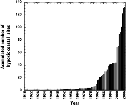 Conventionally, waters are thought to be hypoxic if they contain less than 2 mg O2/liter of water, but a recent study shows hypoxia thresholds for organisms that inhabit the deepest oceanic layer vary greatly. Therefore, the current and future projections for the number and size of oceanic dead zones have been underestimated based on an incorrect assumption for what constitutes the lethal O2 levels. This is evidenced by the fact that coastal hypoxic sites have exhibited an exponential growth rate of 5.54% year-1 over time as hypoxic conditions continue to worsen, most likely due to global warming stresses (Durate and Vaquer-Sunyer, 2008).