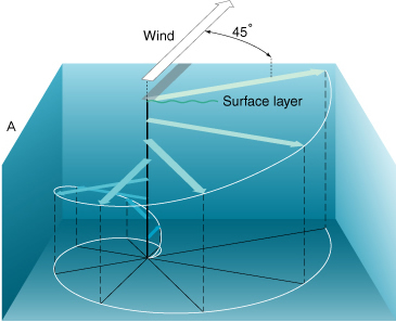 The key to coastal upwelling is the existence of Ekman Transport and the Coriolis effect. The coastal winds drive the surface waters offshore, which draws cold water from the deep ocean the surface to replace the surface waters. The wind driven currents are turned clockwise in the Northern Hemisphere and counterclockwise in the Southern Hemisphere because earth is a sphere and has a tiled rotational axis. As the diagram depicts, the surface waters of the ocean are deflected at a 45 degree angle. Although the lower layers are deflected at a greater angle, they loose energy. The total engery flow will be perpendicular to the wind direction. In terms of upwelling, the Ekman transport moves the fast, surface waters away from the coast, so the nutrient-rich deep water can be brought to the surface.