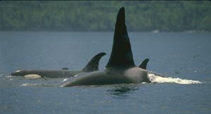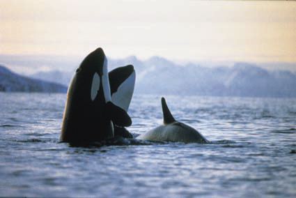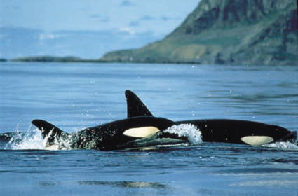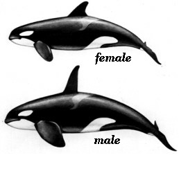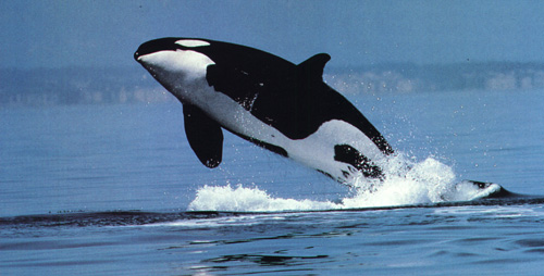 Orcinus Orca Class - Mammalia (Mammals)Orcinus Orca Order - Cetacea Cetacean order includes all whales. This large order is further divided into three suborders: Odontoceti or toothed whales (killer whales, dolphins, porpoises, beluga whales, sperm whales) Mysticeti or baleen whales (blue whales, humpback whales, gray whales, right whales) Archaeoceti (which are extinct) Family - Delphinidae Dolphins and their immediate kin are included in the scientific family Delphinidae. Bottlenose dolphins, common dolphins, and Pacific white-sided dolphins are all delphinids. The killer whale is the largest delphinid. Genus, species - Orcinus Orca Size: Female killer whales average about 5~7m (16~23ft). Male killer whales are usually larger than females, averaging 7~8m (23~36ft.). Weight: Adult females weigh between 1,400~3,600kg (3,000~8,000lb.) and adult males weigh between 3,600~5,400kg (8,000~12,000lb.). The largest male ever recorded was 9.75m (32ft.) and weighed 9,500kg (21,000lb.). The largest female recorded was 8.5m (28ft.) and weighed 6,800kg (15,000lb.). Longevity: Between 25-90 years, with females having a longer lifespan. Estimated Current Population: Unknown, but locally common. The Killer Whale: Killer whales live in groups called pods. A pod may count from less than 5 up to about 30 individuals: a mix of males, females, and calves of varying ages. Sometimes several smaller pods join together to form larger herds of 50 or more whales. During the larger gatherings adult orcas pair with each other to found new families. Orcas are monogamus (they stay with same partner for life). Orcas live long, sometimes up to 90 years, but they reproduce slowly, with a calf about every eight years. Orca is the fastest mammal in the seas, and can swim up to 56km/h (34mph), but they usually cruise at much slower speeds, about 3 to 10km/h (2 to 6mph). They have no natural enemies (exception: large sharks might attack younger orcas). Their diet is very versatile. They eat many kinds of sea fish, and some orcas specialize in sea mammals from sea lions to great Blue Whales. They don't seem to eat humans Orca, like most sea mammals, is a highly intelligent species. Brain of adult male orca weighs at approximately 8kg (16lbs) and it's one of the largest brains on this planet. Unlike the brain of an elephant (also larger than human's), orca's brain has many wrinkles. This means that that the surface area of the gray matter in orca's brain is substantialy larger than that of a human or elephant. Studies on captive orcas have shown that they have a good memory and substantial capability to solve logical problems or act creatively. Orca's intelligence is probably greater than dolphin's and some people go as far as to suggest that orca may be more intelligent than human. I personaly find that idea very interesting. Description: The Orca is a well-known cetacean, made famous by captivity shows. It has a striking skin combination: the primary colour is black, but there is the addition of a grey 'saddle' behind the dorsal, and a brilliant white that covers three areas. Working back from the head, the first of these is the almost elliptical patch behind each eye. The second is on the underside of the jaw, extending back along the throat and belly to the flanks and vent area, where it forms a shape similar to the three prongs of a fork, two reaching up along the flanks while the third covers the vent area. The undersides of the tail flukes are also white. In some regions of the world the primary colour, black, is more of a dark grey. In males, the dorsal fin can reach up to 1.8m in height, and reaches straight up into the air, shaped rather like a triangle. In females the fin is smaller, about half the size, and more curved. The head is rounded, with an indistinct beak, inside of which are 10-12 pairs of large teeth in both the upper and lower jaws. This stocky species reaches a maximum length of 9.75m for males and 8.53m for f emales. The maximum body weights are 10.5 tonnes and 7.4 tonnes respectively. Recognition at sea: The male Orca's dorsal fin is a tell-tale giveaway, being as tall as a man and shaped like a huge triangle. The blow is low and bushy, and they travel in pods of between three and twenty-five individuals, including at least one large male. Geographic Range: Atlantic Ocean, Pacific Ocean, Indian Ocean, Arctic Ocean: Most common in Arctic and Antarctic waters, but also occurs in all other oceans. Natural History: Food Habits Killer whales are versatile predators. They feed on a wide variety of species, ranging from fish to warm-blooded prey such as birds, seals or even other whales. They require 2.5 to 5 percent of their body weight in food each day. making access to a substantial and reliable food source important. Fish and squid probably make up the bulk of their diet, with some pods (see Behavior and Social Systems) specializing in warm-blooded prey. Methods for feeding on squid are unknown, but when hunting in packs the whales trap and atack prey simultaneously. Reproduction Although the whales may breed near the end of the year in some areas, Killer whales appear to breed in spring and summer off the coast of the state of Washington. The gestation period is around a year, and the young at birth are about two meters long. Behavior Orcas are highly social whales, travelling about in discrete social units called pods. The relationships within the pod are stable and may persist from one generation to the next. Each pod contains one adult male, several adult breeding females and a number of sub-adults of both sexes. Pod size may vary from as few as four to as many as forty. Small pods, which are split off from larger ones, are less stable and may die out within a generation, probably because the larger pods monopolize preferred food resources. The orcas hunt together, and this behavior accounts for the evolution of the social links that result in pod formation. The typical family pod can reach a maximu